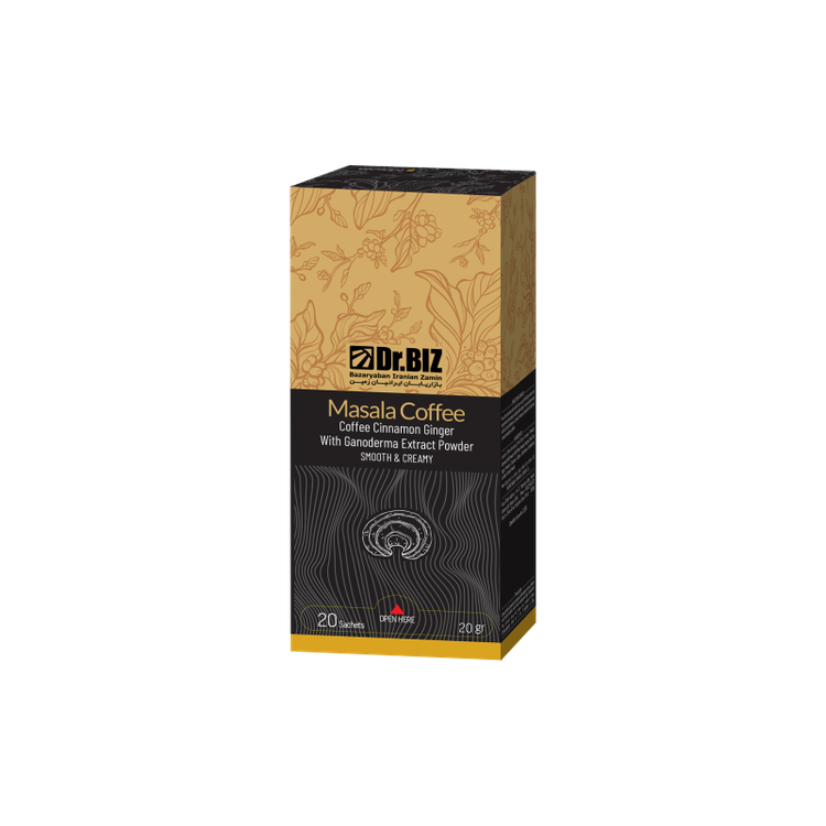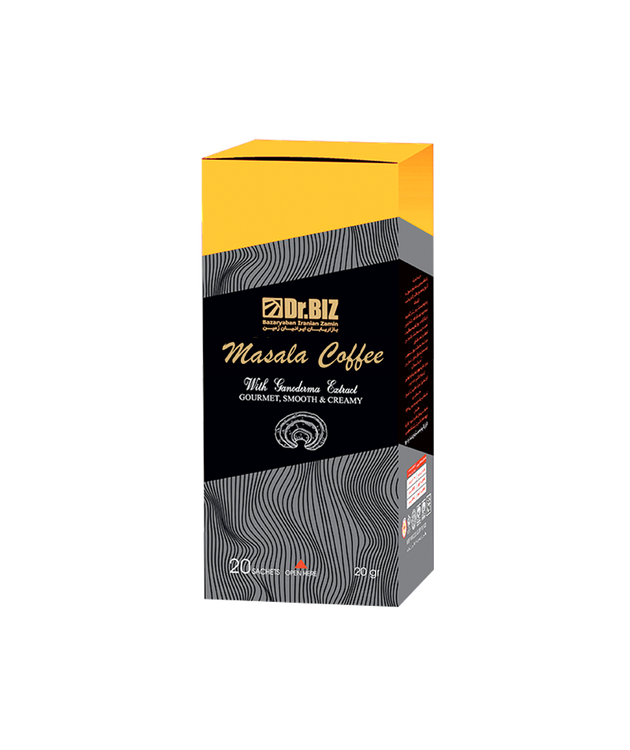 حاوی 20 ساشۀ 20 گرمی کافه ماسالا گانودرما شامل قهوه، عصاره قارچ گانودرما و دارچین و زنجبیل و هل